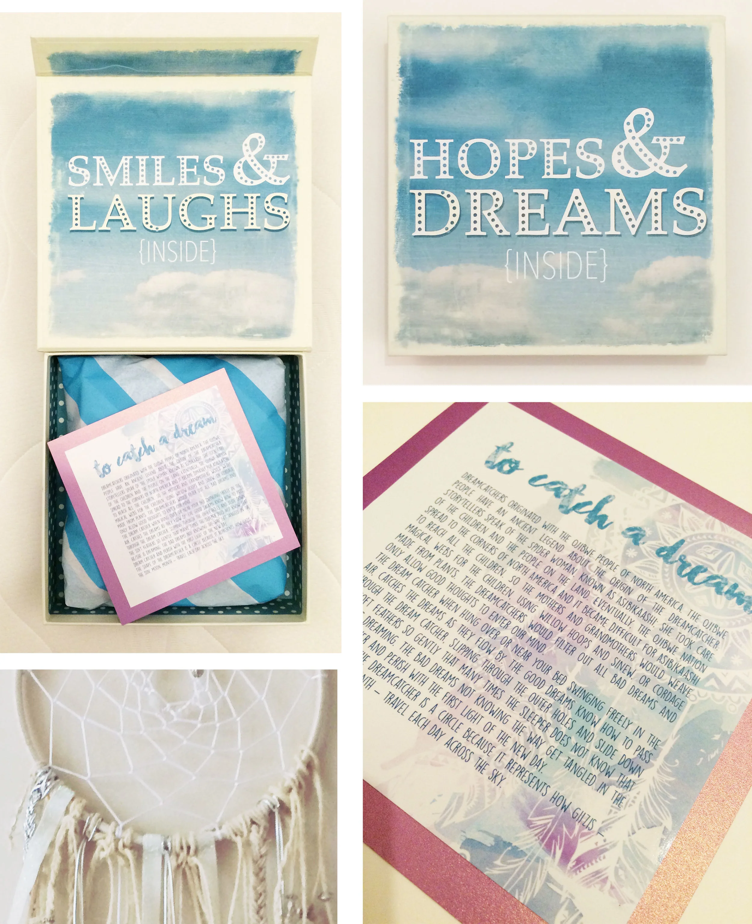 A little while ago I posted some pictures of a dreamcatcher I made for my sister as a Christmas gift, while looking for the right packaging I found the perfect box in TK Maxx, which on the lid says 'Hopes and Dreams (inside)'. To go with this I created a little card about dream catchers to go in the box as well.